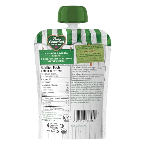 Help your baby fall in love with greens from the start with Baby Gourmet Juicy Pear & Garden Greens. This best-selling blend combines organic spinach and broccoli with juicy pear for a naturally sweet, veggie-forward flavour babies adore. Made for babies 6 months and up, this purée is smooth, easy to digest, and free of added sugar, salt, and artificial ingredients. Each 128 mL BPA-free pouch is perfect for spoon-feeding or independent squeezers, making it ideal for meals at home or on the go. Proudly made in Canada with simple, organic ingredients that support healthy development—because first foods matter.