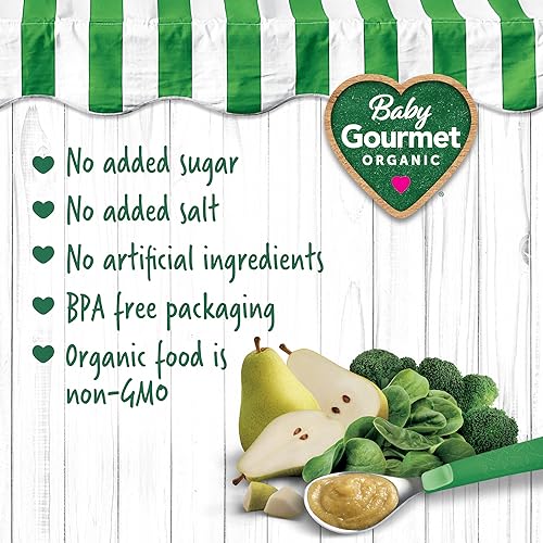 Baby Gourmet Juicy Pear & Garden Greens Purée, 12 × 128 mL Pouches | 6 Months+ | Organic Baby Food | No Added Sugar or Salt | Made in Canada