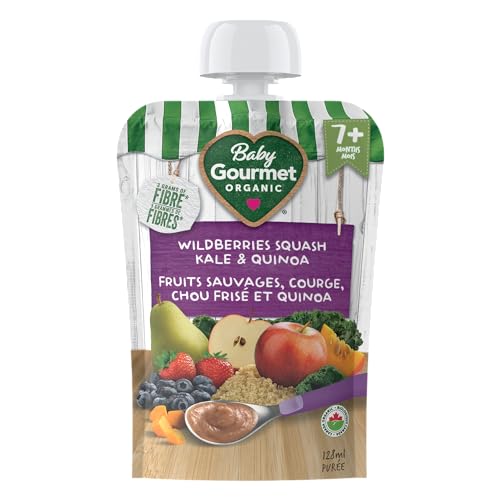 Baby Gourmet’s organic Plus purees are made for little ones’ 7 months and beyond. This organic baby puree is a creative and healthy version of berry crumble made with blueberries, strawberry, apple, pear, butternut squash, quinoa, kale and a hint of vanilla and cinnamon.This fruit and veggie puree provides a source of iron and 3 grams of fibre. Baby Gourmet does not add artificial ingredients, salt, or sugar to their organic baby purees. This pouch package allows for baby to hold and squeeze by themselves or for the pouch to be squeezed directly onto a spoon for mess-free eating.