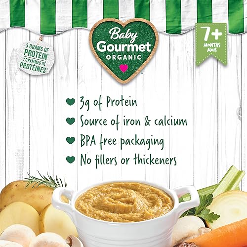 Introduce baby to bold, savoury flavours with Baby Gourmet Veggie Beef & Barley. This protein-rich organic meal blends tender beef with veggies like carrots, potatoes, celery, and mushrooms, plus hearty pearl barley and a touch of rosemary for a stew-like taste babies love. Designed for little foodies 7 months and up, each pouch provides 3 g of protein and is a source of iron and calcium—without any added sugar, salt, or artificial ingredients. Whether at home or on the go, these smooth, ready-to-serve pouches make mealtime easy. Created by a Canadian brand parents trust for wholesome, elevated baby food.