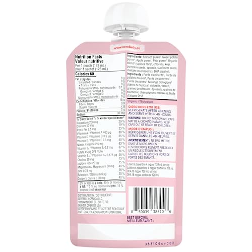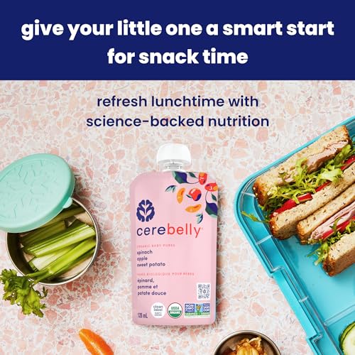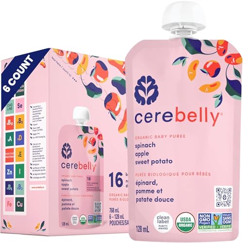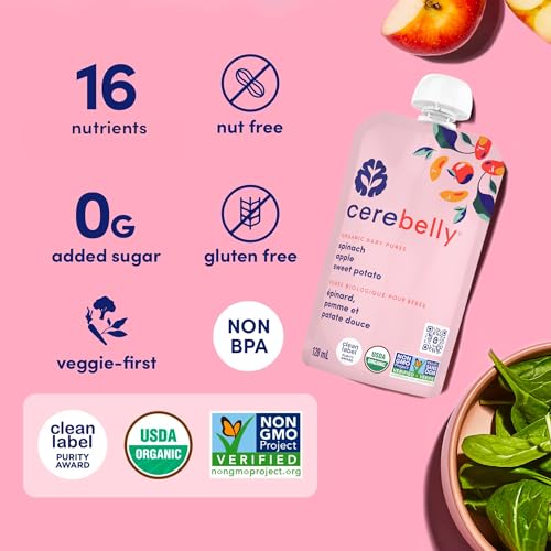 Cerebelly Organic Baby Food Pouches – Spinach Apple Sweet Potato, 128 ml, Pack of 6 |Non-GMO| Sachets d’aliments pour bébé bio Cerebelly – Épinards, pomme et patate douce, 128 ml, paquet de 6|Sans OGM