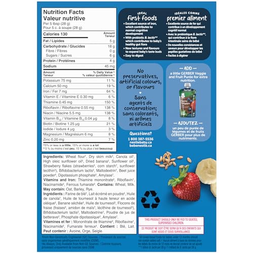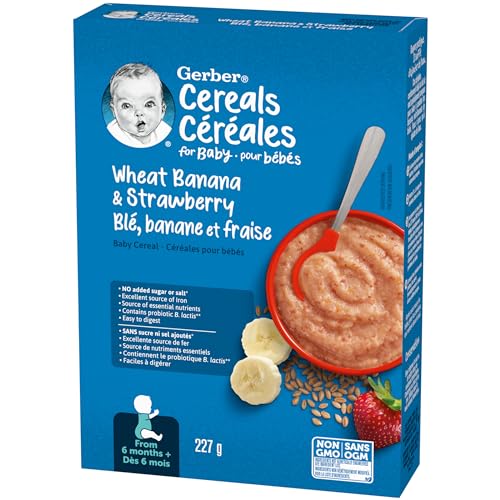 NESTLE GERBER Baby Cereal – Wheat with Banana & Strawberry is the perfect combination of wholesome and delicious. Your little one will love exploring this new taste, while getting 13 essential nutrients including 100% of her daily value for iron, a nutrient that contributes to normal cognitive development. And you can rest easy knowing that it is made with real, delicious fruits and no added preservatives or colours.