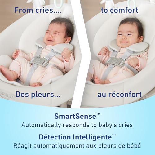 The Graco SmartSense Soothing Baby Swing starts to soothe your baby in seconds, with technology that hears your baby’s cries and responds with calming sound and motion. This baby swing offers thousands of combinations of gentle motions, soft vibration, multiple speeds, white noise, and calming music to help create more peaceful, happy moments for you and your baby. Swing, rock, cradle, and glide motions mimic the way parents naturally soothe their babies, while a cozy body support made with organic cotton fabrics helps keep baby comfortably snug. Three recline positions allow you to customize the swing to what your baby likes best, and a toybar adds additional interest for curious little hands and eyes. The 5-point harness keeps your child secure.