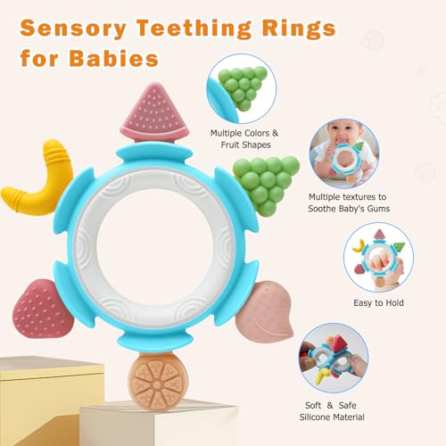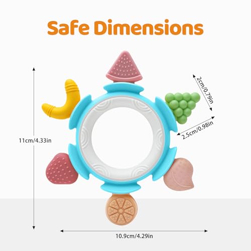 Soothes Teething Pain Naturally: This adorable fruit-shaped teether features six playful designs—peach, grape, watermelon, banana, strawberry, and orange—linked on a secure ring that’s easy for tiny hands to hold. Each textured surface gently massages sore gums, helping to ease teething discomfort and encourage healthy tooth growth. For extra soothing, chill it in the fridge before use