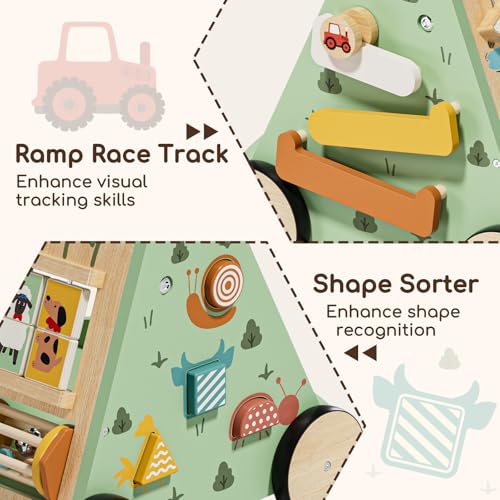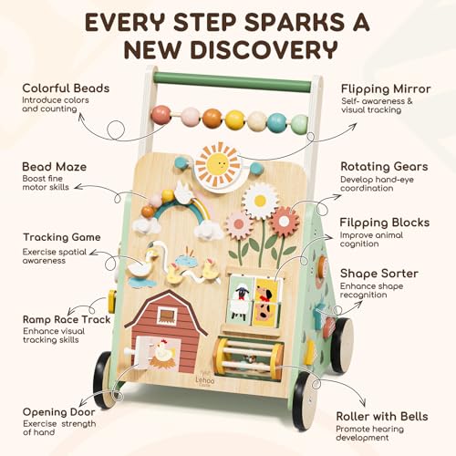 10-in-1 Fun That Grows With Your Baby: From first steps to focused play, this walking helper transforms into a full sensory station. Includes 10 engaging features: a baby-safe mirror, colorful rolling beads, flower gears, duck maze, shape sorter, barn door, animal puzzle, tractor glide track, and a spinning drum. These interactive elements promote fine motor skills, hand-eye coordination, and early cognitive development