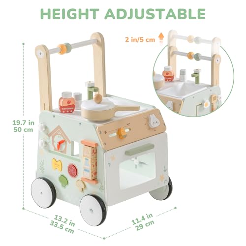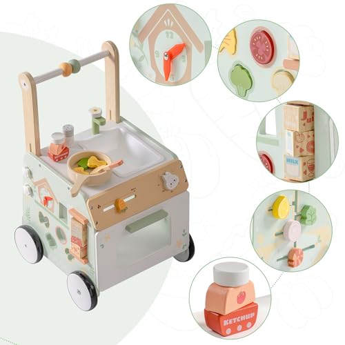 Promotes Fun, Active Learning: Made from eco-friendly, durable wood, this wooden baby walker is designed for play and growth. Its interactive features—like clock, shape matching, salad sliders, and so on—keep your toddler engaged. Ideal for walking toys for 1 year old learning to walk, it makes physical and sensory development a blast.