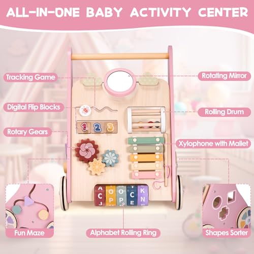 👧【Baby Push Walker】Our wooden baby walker is not just a reliable walker, it’s also a multifunctional interactive push and pull learning activity toy. The exquisite Montessori toy design infuses it with vibrancy and joy, featuring a rotating mirror,Xylophone,Maze, Rotary Gears, Letter Rolling Ring, and Shapes Sorters for interactive play. With our activity walker, babies can enjoy hours of playtime while promoting cognitive development and hand-eye coordination in a colorful and fun environment.