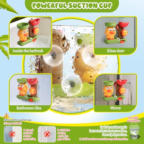 【Suction Cup Tips for Bath toys】 Press the suction cups firmly onto smooth, clean surfaces like walls, bathtubs, marble, or glass until all air escapes. For questions or quality issues with this baby water toy, contact the seller directly – we will provide a solution.