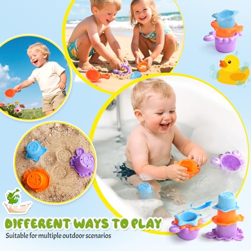 【Bonding Through Bath Time Fun】Watch your baby’s eyes light up and feel their excitement as you guide their little hands together to scoop and pour water. 3 cute animal shaped stacking cups can be played not only in the water but also at the beach with a little game of stamps. Funny animal characters inspire your baby to laugh and communicate. These 1 2 3 year old girl boy toys can develop baby’s hand-eye coordination. Kids bath toys are ideal for little adventurers.