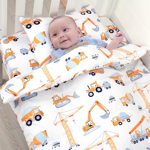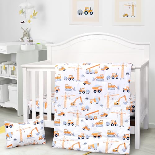 JISEN 3 Piece Crib Bedding Set Soft Baby Crib Bedding Set Construction Trucks Crib Comforter Set – Comforter Sheet Pillowcase Nursery Bedding Sets for Baby Girls or Boys