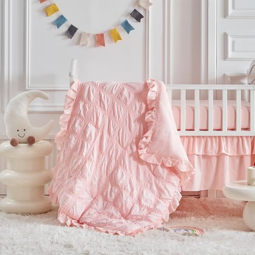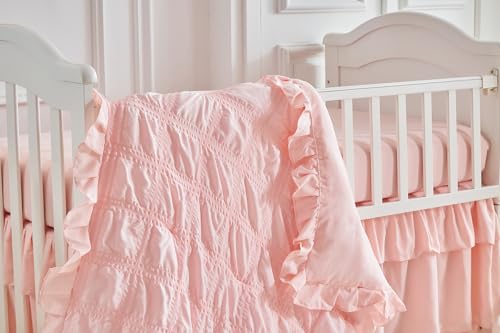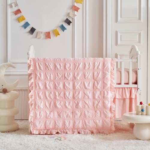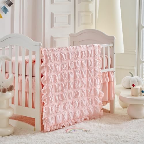 Ruffled Crib Bedding Set Baby Boho Quilted Comforter with Fitted Sheet and Bed Skirt – Cute Soft Breathable Seersucker Ruffled Shabby Chic Bedding Soft Blanket Design – Pink