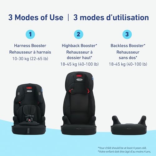 3-in-1 harness booster helps protect your child, from toddler to youth: Grows with your child from forward-facing harness 10-30 kg (22-65 lb) to highback booster 18-45 kg (40-100 lb) to backless booster 18-45 kg (40-100 lb)