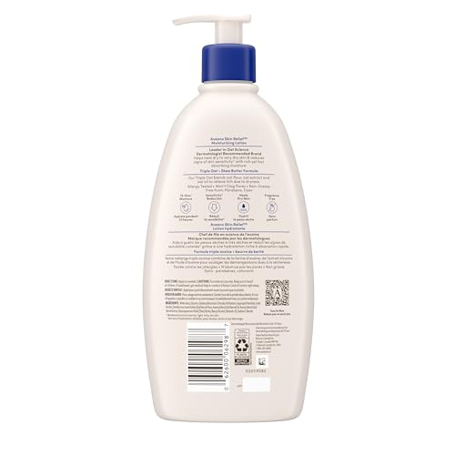 Aveeno Skin Relief Moisturizing Lotion is clinically proven soothing relief for itchy, dry skin with 48-hour moisture. Formulated with Triple Oat and shea butter that provides soothing relief for itchy, dry skin and locks in long lasting moisture. This skin relief moisturizing lotion is clinically proven to help relieve and soothe itchy and dry skin. The creamy shea moisture lotion has a rich formula that can be used on sensitive skin and can be used as part of your daily skincare routine. From a dermatologist recommended brand, the fragrance free Aveeno Skin Relief Moisturizing Lotion has a non-greasy formula that is paraben free, dye free, non-comedogenic, non-GMO oats, and allergy tested. Moisturize sensitive skin for 48 hours with Aveeno Skin Relief Moisturizing Lotion. The fragrance free moisturizing lotion helps heal and relieve itchy and dry skin. This product is made with 30% Post-Consumer Recycled Plastic and is available in a 222-millilitre tube, 354-millilitres pump bottle, 532-millilitre pump bottle, and 975-millilitres pump bottle of fragrance free body lotion for itchy, dry skin and locks in long-lasting moisture.