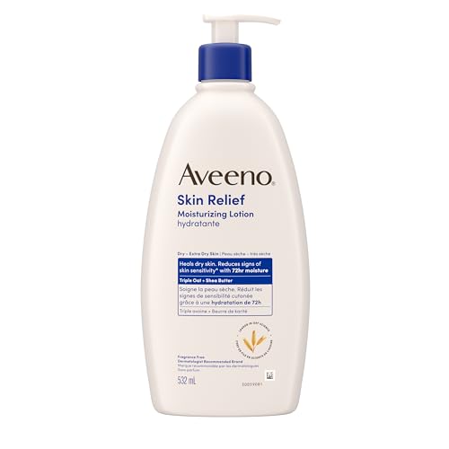 Moisturize sensitive skin for 48 hours with Aveeno Skin Relief Moisturizing Lotion. The moisturizing lotion helps heal and relieve very dry skin. This product comes with one 532-millilitre bottle of fragrance free body lotion. Bottle made with 30% post-consumer recycled plastic.