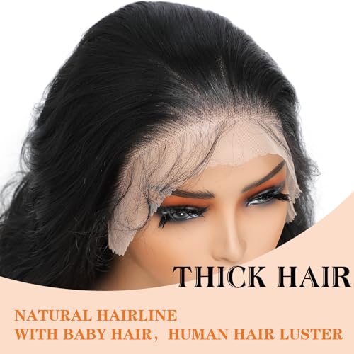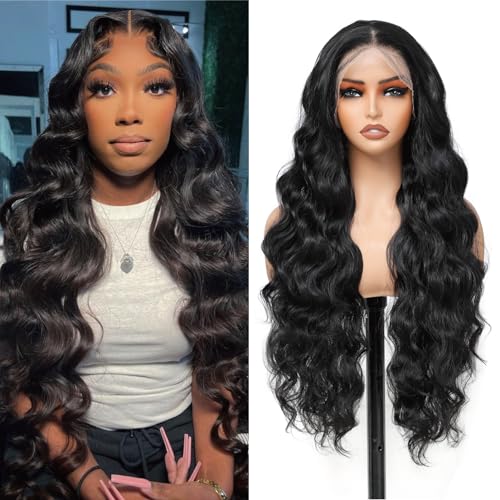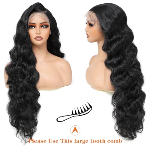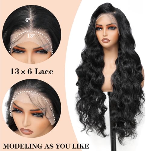 13×6 Lace Frontal Wig Long Body Wave Wigs Pre-Plucked Hairline with Baby Hair Transparent Swiss Lace Heat Resistant Synthetic Hair Glueless Lace Front Wavy Wigs for Women 32 Inch (#Black)