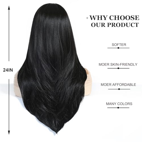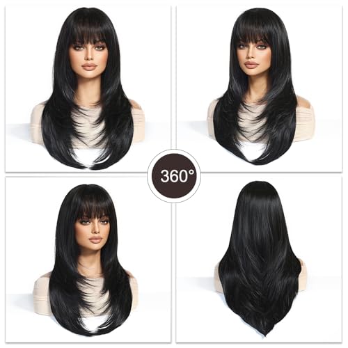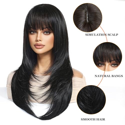 Esmee Long Straight Black Brown Wigs for Women with Fringe Natural Synthetic Hair Wig for Daily & Party Use