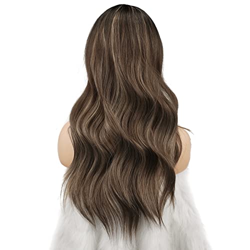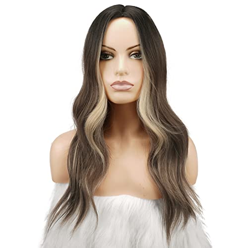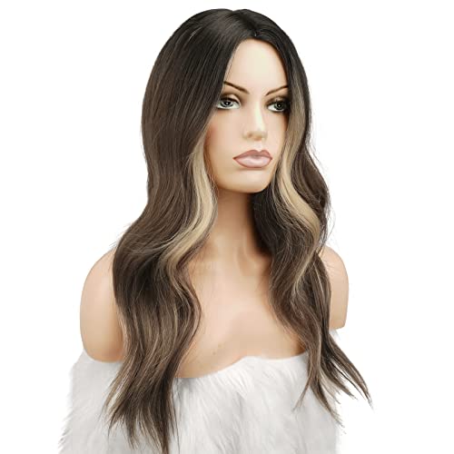FESHFEN Long Brown Blonde Wig for Women, Middle Parting Synthetic Wavy Wigs for Daily Party, Brown Mixed Blonde Highlighted 24 inch