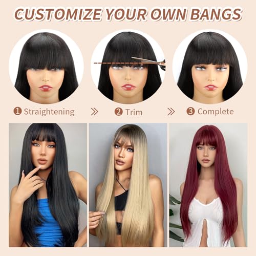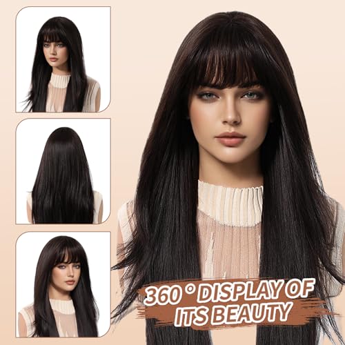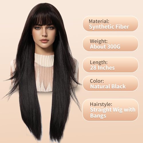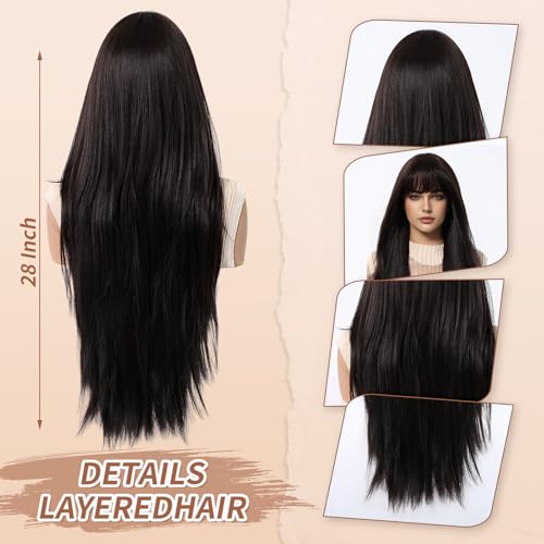 Long Straight Wigs with Bangs Black Layered Hairstyle Synthetic Heat Resistant Straight Hair for Girls Daily Party Use 28 Inch (1B)