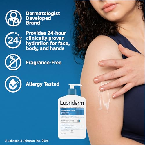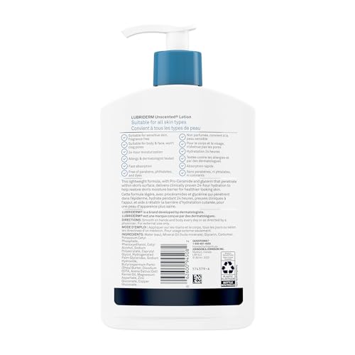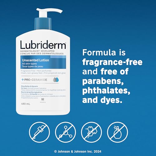 LUBRIDERM UNSCENTED Lotion is clinically proven to moisturize skin for 24 hours. From a dermatologist-developed brand, this lotion helps relieve dry skin and prevents dryness from reoccurring throughout the day. This formula enriched with vitamin B5 and skin-essential moisturizers improves skin’s moisture barrier for healthier-looking skin. This lotion is fragrance-free, non-greasy, fast-absorbing, and great for smoothing over hands and body every day. LUBRIDERM UNSCENTED Lotion comes in a 480-millilitre pump bottle.