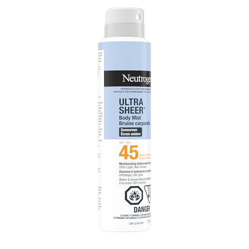 Neutrogena Ultra Sheer Body Mist Sunscreen Spray SPF 45 for UVA/UVB Broad Spectrum Sun Protection, Lightweight, Water-Resistant, Oil-Free & Non-Comedogenic, Oxybenzone-free, 141g