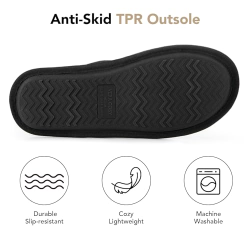– This cozy slipper features a high-density memory foam and 17mm EVA heel, which is tailored to different types of feet.