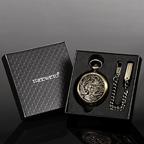 TREEWETO Mechanical Skeleton Pocket Watch Silver Lucky Dragon + Gift Box