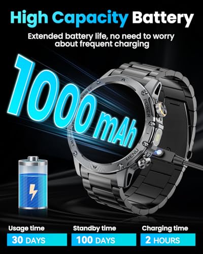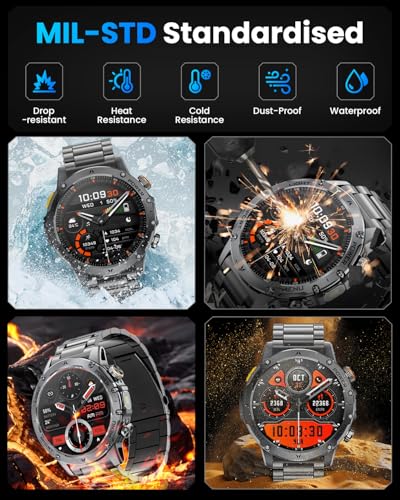 Military Standard Quality: This smartwatch is manufactured according to military standards and is made of stainless steel metal case, military watches have strong resistance to scratches, drops and polishing, and have passed the tests of temperature, high altitude and low air pressure, dust, salt spray and liquid contamination, easily adapts to different harsh working environments