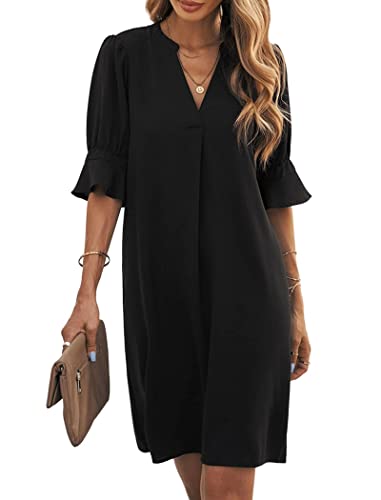 Famulily Womens Dresses V Neck Puff Sleeve Solid Loose Fit Casual Summer Beach Flowy Shirt Dress