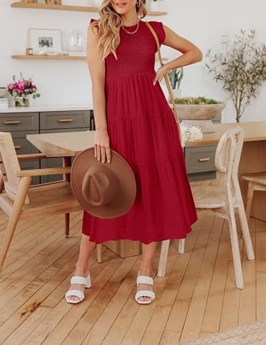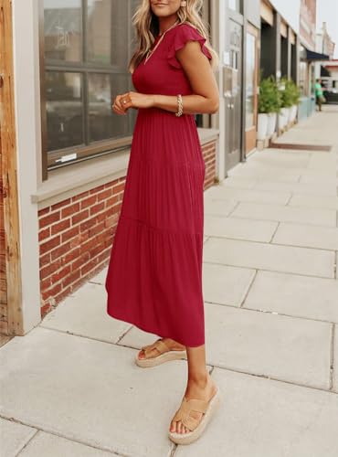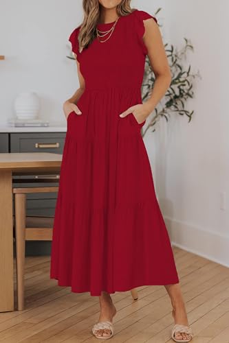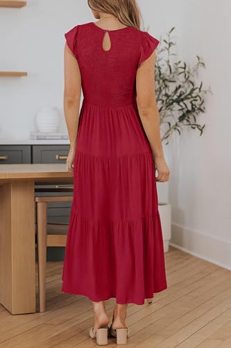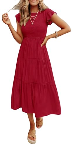 Women’s Summer Casual Midi Dress Boho Flutter Sleeve Crew Neck Smocked Flowy Tiered A-Line Long Beach Dress