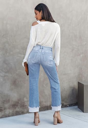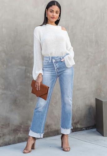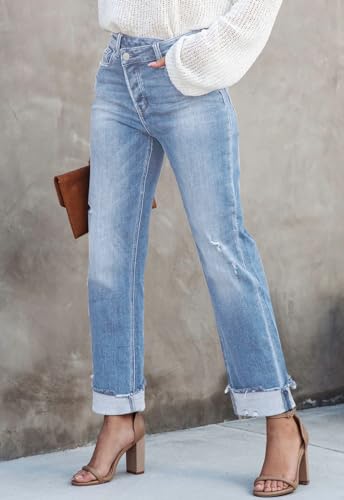 *These stretchy jeans for women /distressed jeans for women/women’s boyfriend jeans features high waisted, Classic 5 pockets,asymmetrical crossover closure.This women’s boyfriend jeans has wide legs and stretchy fit, elongate your thighs throughout a comfortable straight leg feel.This distressed ieans for women high waisted boasts a straight leg design,high rise,super stretchy jeans fit highlight your attractive figure.These boyfriend jeans for women add a touch of stylish and young vibe.The ripped cuffed jeans for women is made of stretch denim fabric. The high waisted stretch jeans for women with perfect length & unique asymmetrical style them a perfect stylish outfits. Durable,soft and stretchy denim pants fabric,allowing you to move freely throughout your day.These stretch jeans for women are suitable for casual daily wear,street,party,going out,travel,night,dating etc.It is easy to paired with simple or gorgeous tops,with heels to create casual or fashion look. These 2023 women’s trendy jeans are the perfect addition to any outfit. A staple for your jeans wardrobe!