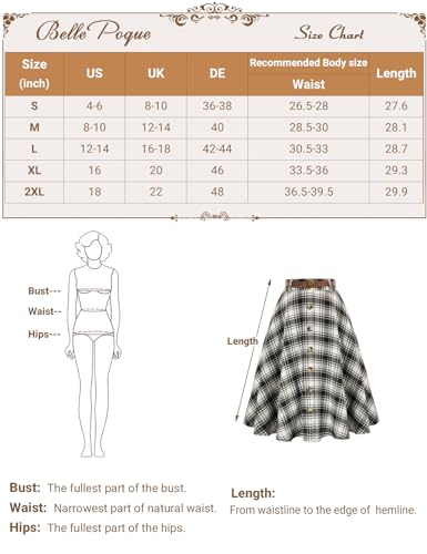 Belle Poque Women’s Plaid Skirt High Waisted A-Line Flared Midi Skirts with Pockets & Belt