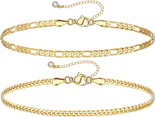 KissYan Gold Layered Ankle Bracelets for Women, Dainty 14K Gold Plated Layering Anklets Set Adjustable Trendy Cuban Link Snake Tennis Figaro Chain Ankles Summer Beach Foot Jewelry Gifts for Women