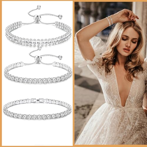 YADOCA 3 Pcs Tennis Bracelets for Women Silver Tone 4mm 5A+ Cubic Zirconia CZ Diamond Classic Tennis Slider Bracelet Fashion Jewelry Wedding Gift Adjustable Size 7 Inch