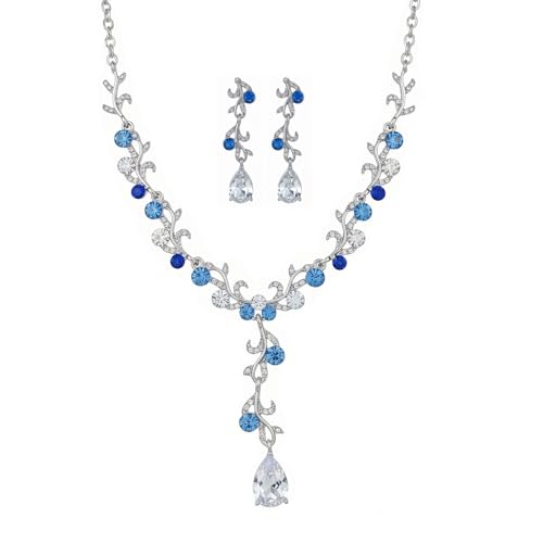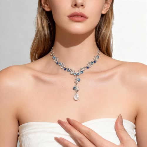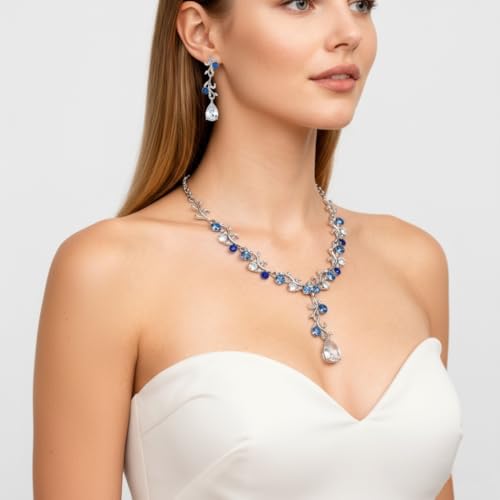 Each piece is a work of art—from the intricate floral motif to the shimmering cascade of crystal dewdrops to the captivating blue center stone. Whether you’re a bride walking down the aisle, a bridesmaid cherishing friendships, or the star of your event, this jewelry set is more than just an accessory; it’s the perfect finishing touch.