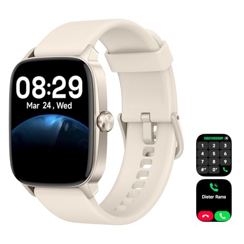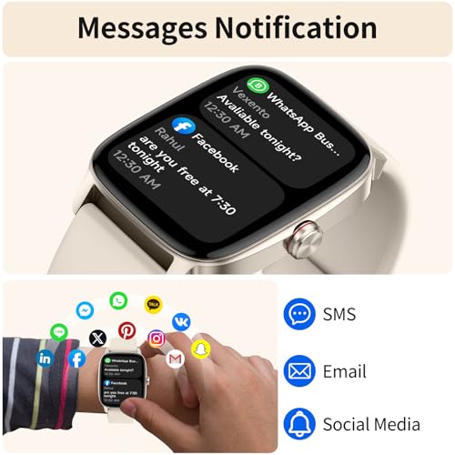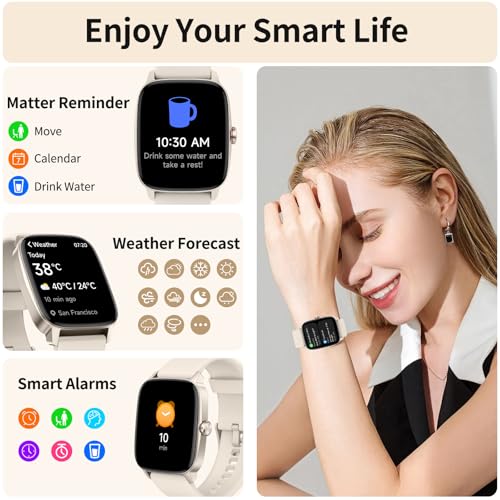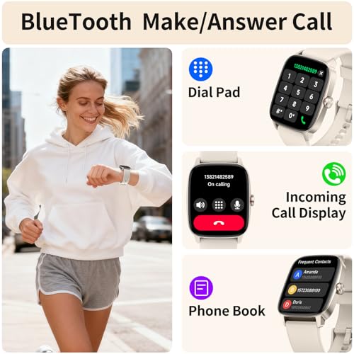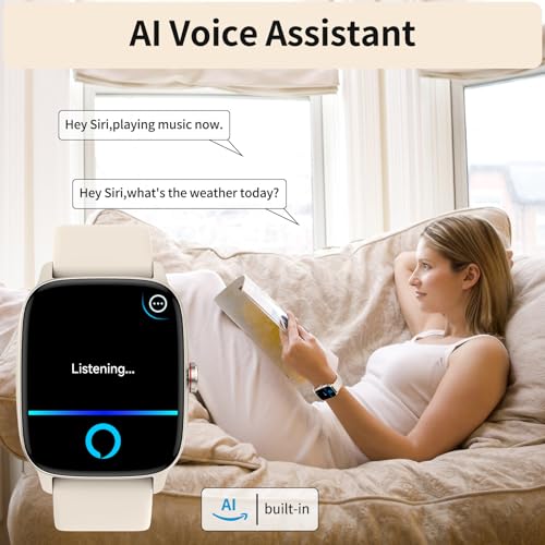 [Bluetooth Call & AI Voice Assistant] This Android and iOS compatible smartwatch for men and women connects to your phone via Bluetooth 5.3 and a dedicated app. Equipped with a built-in microphone and speaker, it allows you to easily answer/make calls, store contacts, view call history, and receive notifications and messages from various apps on your phone. With the built-in AI voice assistant, you can ask questions, control music playback, check the weather, set alarms and timers, and more, just by speaking to the watch.