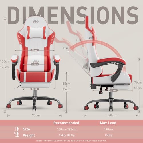 HLDIRECT Gaming Chair, Video Game Chair with Pocket Spring Cushion, Ergonomic Computer Chair for Adults with Headrest and Massage Lumbar Support, Swivel PU Leather Office Chair(White&Red)