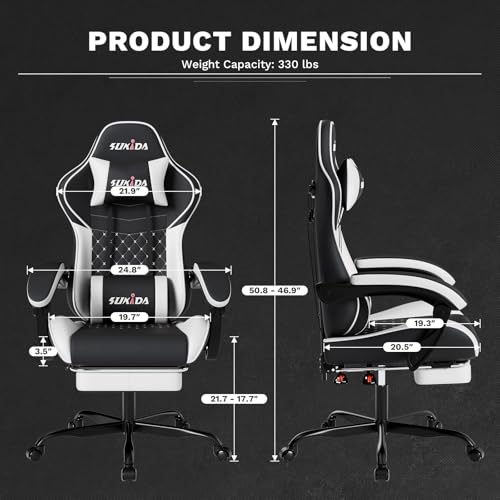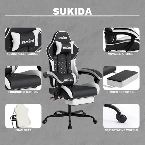 SUKIDA Black Gaming Chair Massage Gamer Chair Adult Gamers Choice Size Cool Big People, PC Video Game Ergonomic Gamingchair with Footrest, Racing Office Computer Reclining Comfortable Recliner