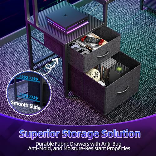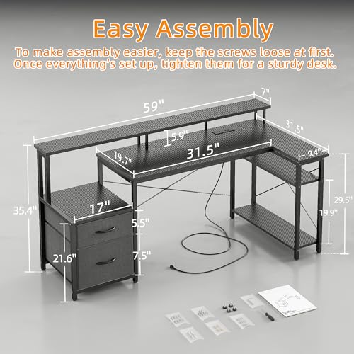 BEXEVUE Computer Desk L Shaped with Drawers, 59 inch Gaming Desk with Power Outlets and LED Strips, Large L Shaped Corner Desk with Monitor Stand, Home Office Desk for Corner Space, Carbon Black