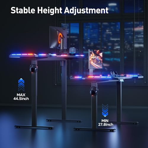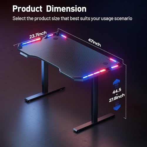 HLDIRECT 47 Inch Standing Gaming Desk with LED Lights Height Adjustable Table with Headphone Hook, Stand up Desk with 3 Preset Heights Workstation for Home Office Bedroom Gaming, Carbon Fiber Black