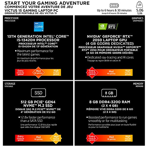 Victus by HP 15 Gaming Laptop helps you keep up with the biggest games and the best players. Play at your best with a 13th Gen Intel Core processor , a modern graphics card, and plenty of memory. From the updated thermal design to the HD camera, this laptop has everything. Going beyond just raw processor speed. With 13th Gen Intel Core Processors, Intel advanced its hybrid design and made it even better. A faster performance core means getting dedicated tasks done faster and easier. More efficiency cores mean better multi-tasking. The same great graphics and best in-class connectivity means a fully immersive display and ultra-responsive wired and wireless connections. NVIDIA GeForce RTX 20 Series GPU with 1080p Full High Definition resolution for smooth, crisp gameplay. Enjoy the sun and your favorite content with this anti-glare panel. Non-reflective and low gloss means you’ll get less glare while you’re outside. Plus, this sustainable PC contains ocean-bound and post-consumer recycled plastic. The HP Victus 15.6 inch gaming laptop comes with a 150 W Smart AC power adapter. HP is here to help. This HP computer comes with 1-year limited hardware warranty and 1-year limited technical support for software and initial setup with 24-hour, 7 days a week web support when shipped from and sold by Amazon.ca.