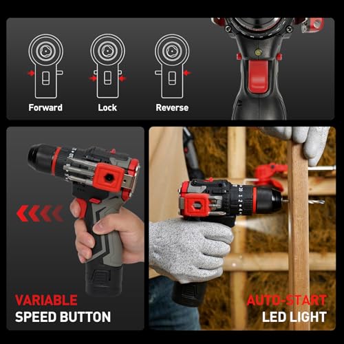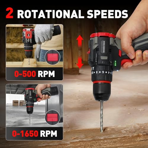Precise Torque and Dual-speed Control: 20+3 torque Settings combined with two mechanical speed adjustments allow you to precisely control your operations. The low-speed range (0-500 RPM) of the battery drill is suitable for precise screw tightening and small-hole drilling. The high-speed gear (0-1650 RPM) is used for rapid drilling and impact operations, easily handling a variety of materials such as wood, metal, tiles and walls