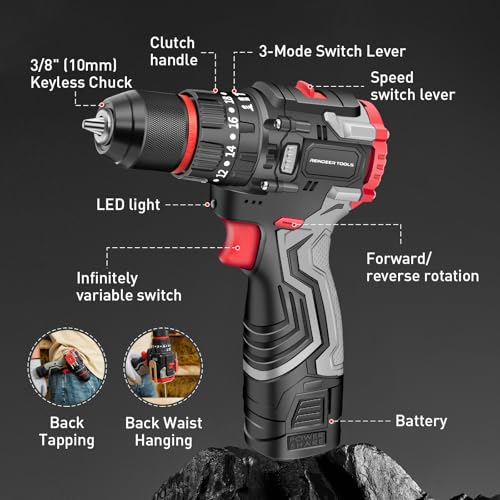 Cordless Drill Set, 20+3 Torque Setting, 398 in-lb, 16V Electric Power Drill with 3/8″ Keyless Chuck, 2 Speed, 2 * 1.5Ah Batteries, Drill Driver Bits Kit, LED Drill Driverl RDN100