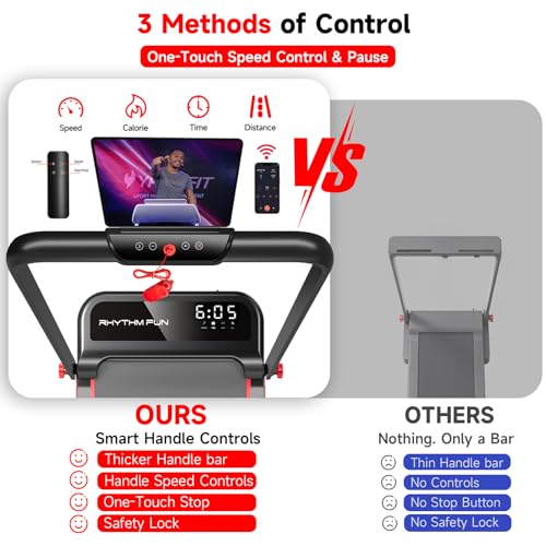 【Powerful But Quiet Treadmill】Rhythm Fun treadmill is equipped with a powerful 2.5HP low-noise motor.Which can withstand loads up to 300 lbs. The portable walking treadmill enables speeds ranging from 0.5-5 mp/h(0.8 to 8.0 km/h). Manual Incline adjustment can meet the fat burning effect of 50% higher than traditional treadmills.