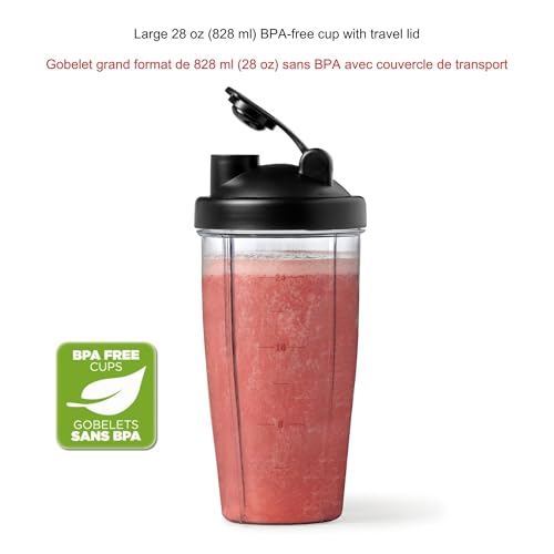 - Large 28 oz (828 ml) BPA-Free Cup with travel lid lets you blend and drink from the same container.