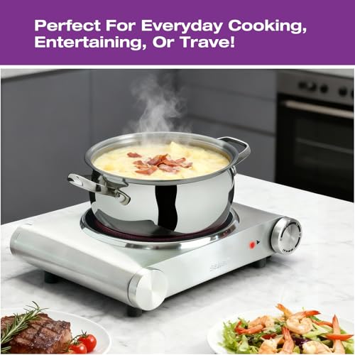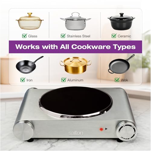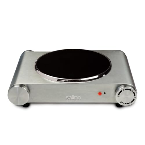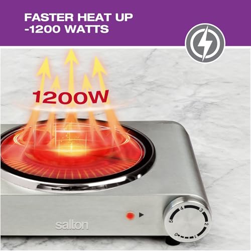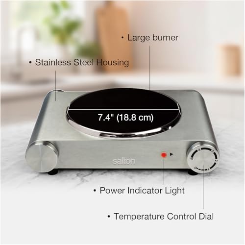 Salton Single Stainless Steel Infrared Portable Electric Cooktop with Large 7.4” Diameter Burner, Variable Tempertature Control and Indicator Light, Perfect for Entertaining, 1200 Watts (HP1502)