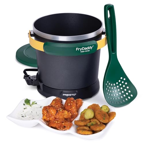 Make delicious deep fried foods fast and easy for your game day gatherings! The FryDaddy® deep fryer, sporting green and gold accents, makes crispy, crowd-pleasing french fries, onion rings, chicken, shrimp and more. FryDaddy® electric deep fryer features a preset thermostat that maintains the ideal frying temperature automatically. With an efficient 4:4 oil-to-food ratio, fry four servings of french fries in just four cups of oil, and enjoy the added benefits of quick preheat time and fast oil temperature recovery. Use the heat resistant lift-and-drain scoop for serving foods after frying. The snap-on lid secures oil for reuse, if desired, without spills or odor. Cleanup is easy with the PFAS-free ceramic nonstick surfaces inside and out. The convenient swing-up handle makes FryDaddy® easy to carry and store.