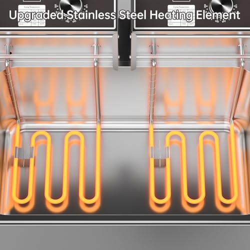 【Reliable Temperature Control】- This commercial electric fryer is equipped with dual heating elements, allowing it to heat oil to your desired temperature in a short time.The temperature level is regulated with a manual knob and ranges from 140°F – 392°F, Upgraded 304 stainless steel heating tubes with temperature probe for evenly heat distribution, and the temperature indicator light displays when the fryer is heating the oil allows you to easily fry a variety of foods