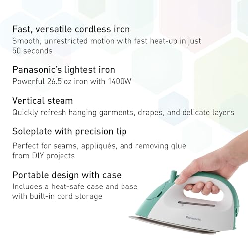 Panasonic NIQL300G Mini Cordless Steam & Dry Iron – 1400W Lightweight Iron for Clothes, Crafts & Quilting – Portable Ceramic Soleplate with Precision Tip, Fast Heat-up, Anti-Drip, Travel Carry Case
