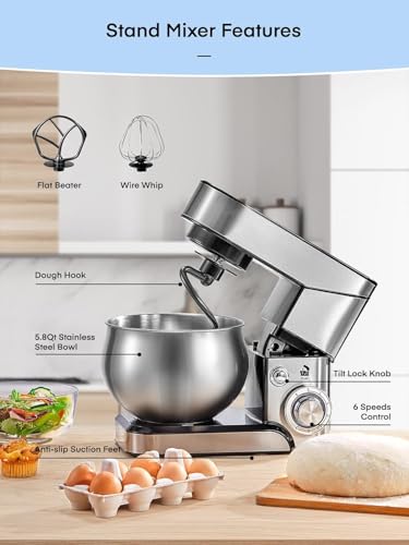 Stand Mixer 5.8 QT, FOHERE 6+P Speed Tilt-Head Food Mixer with Dough Hook, Mixing Beater, Wire Whip, Bowl, Stainless Steel Mixer, Electric Kitchen Mixer for Home Cooking, Cake, DIY