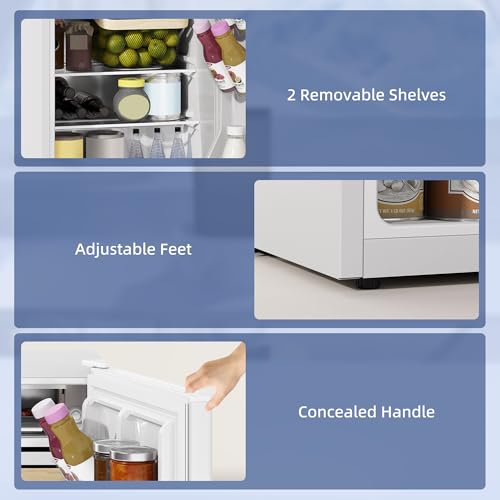 Elegant and Functional: Thoughtfully designed with a concealed handle for a sleek look and adjustable foot pads for stability, this compact fridge blends style and practicality to complement any space.